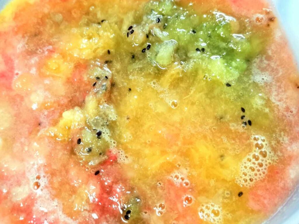 いっぺんにたくさん買った方が安いんだけど、これは困ったぞと。そこでジュースにしようと考えるわけです。さらに色んなフルーツを混ぜ合わせると、単体で食べるよりうまいってことに気が付いて。