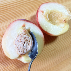 桃は軽く洗い、割れ目に沿ってアボカドを切るときのように包丁で一周切り込みを入れる。優しくねじり、半分に分ける。
