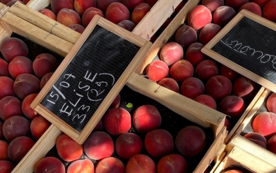 初夏のこの時期、どこのマルシェにも色んな種類の桃が山積みになって、通りが熟した桃の甘い香りに包まれます。桃好きにはたまらない美しい光景! フランスの桃は種類がとても豊富で、丸い形の白桃・黄桃はもちろん、平らなものや、うぶ毛がなくツルッとしたものまであって、それぞれに味と香りがしっかりと凝縮しています。日本ではあまり馴染みがないのですが、酸味もあり、果肉もしっかりとしているので、オーブンでローストしたり、バーナーで炙ったりと加熱調理することが多いのもフランスならではだと思います。